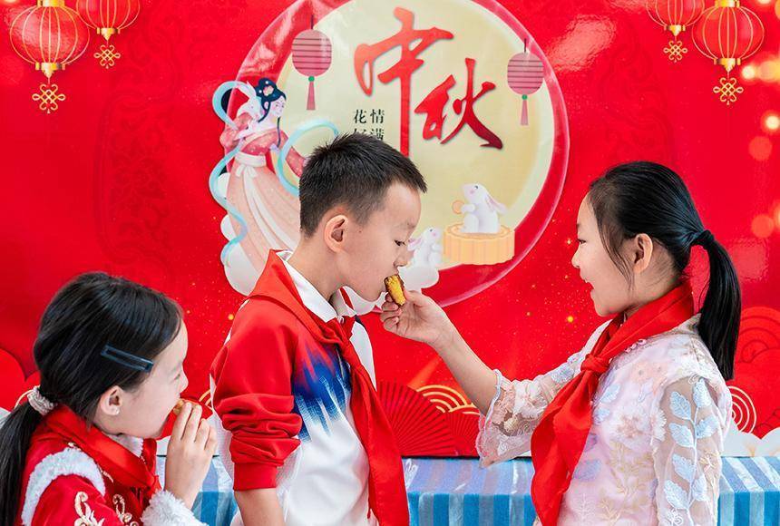 内蒙古呼和浩特市玉泉区清泉街小学学生在中秋节主题活动上品尝自己制作的月饼。丁根厚摄