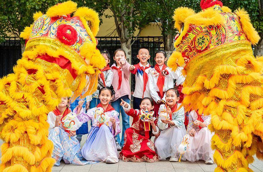 内蒙古呼和浩特市玉泉区清泉街小学表演舞狮的学生在中秋节主题活动上和同学们快乐互动。丁根厚摄